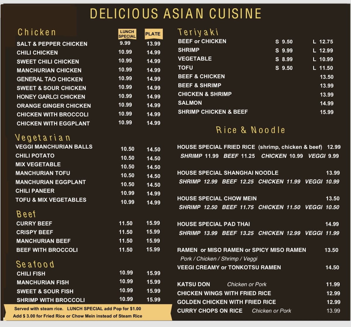 - Chicken Dishes: Indulge in favorites like Curry Chicken Chop On Rice and General Tso's Chicken—both a generous size and bursting with flavor.