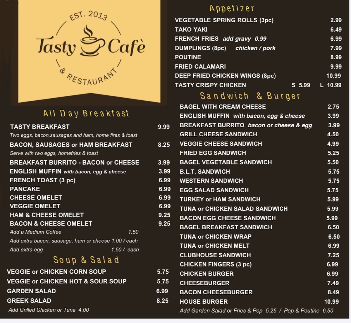 Welcome to Tasty Cafe, a delightful spot situated at 989 Derry Rd E, Mississauga. This cozy cafe is renowned for its generous portions and reasonable prices, showcasing a diverse menu that satisfies all palates.